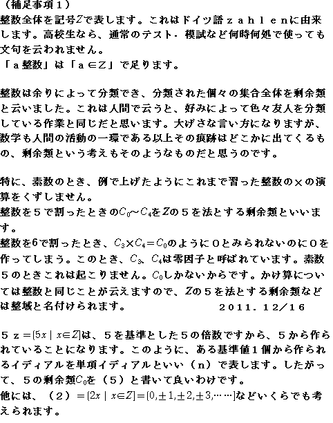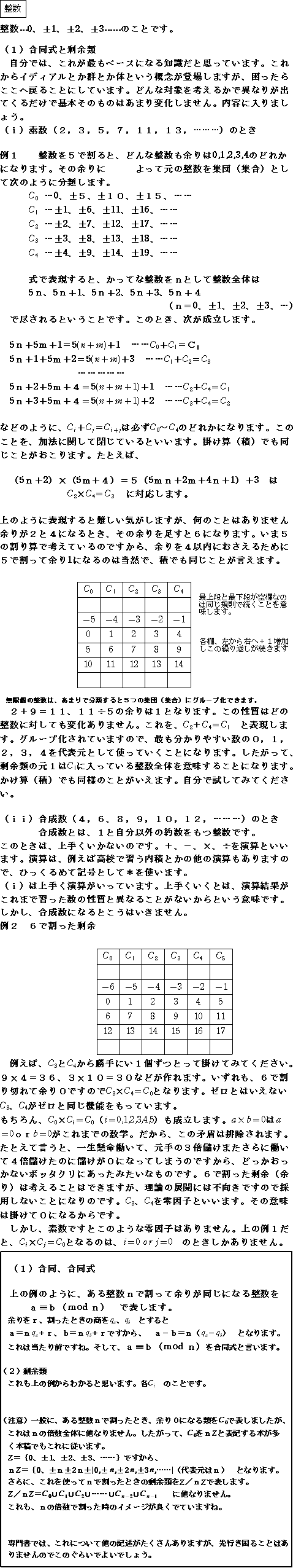 (1) 整数、合同式、剰余類、イディアル (1)-1 整数は言うまでもありません。通常、こうだとすぐ浮かぶものでよい。 |