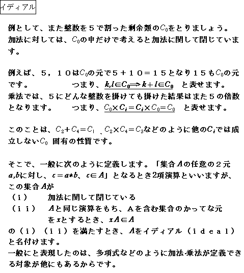 | (注意) 1。 上の*印は演算を表す記号です。+とか×とか思って下さい。 2。 (ii)のxAは、xとAのかってな元のかけ算がまたAの元になることを意味します。 イディアルは整数を代表とする代数系(環(ring)と呼ばれる)に固有の概念です。このイディアルに触れなくても 論を前に進めることができますが、形式上の問題というか議論をすっきりさせる ために取り上げます。やがて、 同型という概念に入っていきますが、この同型に持ち込むための下準備になります。 |